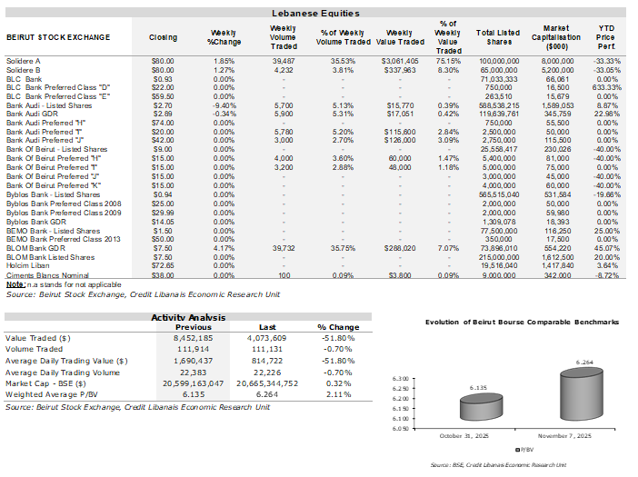 Activity on the Beirut Stock Exchange (BSE) continued heading downstream during the week of November 7 with the number of shares changing hands decreasing to 111,131 shares compared to 111,914 shares in the week before and value traded dropping to $4.07 million compared to $8.45 million a week earlier. Trades were concentrated in banking sector stocks, which accounted for 60.57% of weekly traded volume.