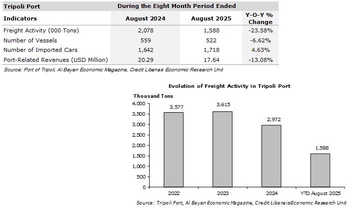 Freight activity via the Port of Tripoli improved during the month of August 2025 with the total weight of shipped goods increasing to 214 thousand tons compared to 201 thousand tons a month earlier (6.47% increase). Imported freight accounted for 53.27% (114 thousand tons) of total freight, while export activity constituted 46.73% (100 thousand tons). On a cumulative basis, Tripoli Port freight activity fell by 23.58% y-o-y to 1,588 thousand tons in the first eight months of 2025 compared to 2,078 thousand tons in the same period last year. Similarly, the number of vessels decreased by 6.62% on a yearly basis to 522 while the number of imported cars rose by 76 (4.63%) to 1,718 cars. In this context, port-related revenues dropped by 13.08% y-o-y to $17.64 million up until August 2025, compared to $20.29 million in the first eight months of the previous year.