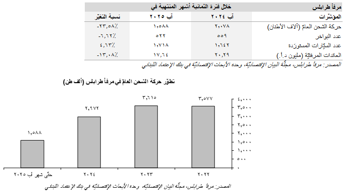 تحسّنت حركة الشحن العامّ عبر مرفأ طرابلس خلال الشهر الثامن من العام 2025 حيث زاد الوزن الإجمالي للبضائع إلى 214 ألف طن في شهر آب مقابل حوالي 201 ألف طن في شهر تمّوز (إرتفاع شهريّ نسبته 6.47%). في التفاصيل، شَكَّلَت الشحنات الوارِدة 53.27% (114 ألف طن) من الوزن الإجمالي للبضائع، في حين بلغت نسبة الحمولات المصدَّرة 46.73% (100 ألف طن). أمّا على صعيدٍ تراكميٍّ، فقد تراجع الوزن الإجمالي للبضائع المشحونة عبر مرفأ طرابلس بنسبة سنويّة بلغت 23.58% إلى 1،588 ألف طن في الأشهر الثمانية الأولى من العام 2025 مقارنةً ب2،078 ألف طن خلال الفترة نفسها من العام 2024. بالتوازي، إنخفض عدد البواخر بنسبة 6.62% على أساس سنويّ إلى 522 باخرة، فيما إرتفع عدد السيّارات المستوردة ب76 (4.63%) إلى 1،718 سيّارة مقارنةً ب1،642 سيّارة خلال الفترة نفسها من العام 2024. أمّا في ما يخصّ العائدات المرفئيّة لمرفأ طرابلس، فقد إنكمشت هذه الأخيرة بنسبة سنويّة قدرها 13.08% إلى 17.64 مليون د.أ. حتّى شهر آب 2025 مقارنةً ب20.29 مليون د.أ. في الفترة نفسها من العام 2024.