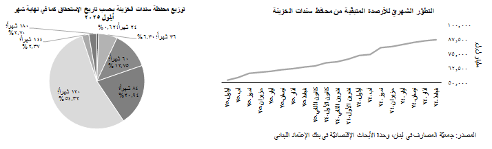 بحسب إحصاءات جمعيّة المصارف، تراجع رصيد محفظة سندات الخزينة بنسبة 3.93% في شهر أيلول 2025 إلى 52،431 مليار ل.ل. من 54،577 مليار ل.ل. في شهر آب ليصل رصيد سندات الخزينة المستحقّ منذ بداية العام 2025 ولغاية شهر أيلول إلى 14،734 مليار ل.ل. بذلك، تكون قد تراجعت محفظة سندات الخزينة القائمة على صعيد سنويّ بنسبة 28.62% من 73،458 مليار ل.ل. في شهر أيلول من العام السابق. ويأتي هذا التراجع المستمرّ في القيمة الإسميّة لهذه المحفظة في ظلّ توقّف وزارة المال عن إصدار سندات جديدة منذ شهر كانون الأول 2023. وقد شكّلت سندات الخزينة التي تبلغ مدّة إستحقاقها 120 شهراً حصّة الأسد (54.32%) من الرصيد المتبقّي لسندات الخزينة بالليرة اللبنانيّة كما في نهاية شهر أيلول 2025، تلتها تلك من فئة ال84 شهراً (حصّة 20.94%) وتلك من فئة ال60 (12.75%) وال36 (6.30%) شهراً للذكر لا للحصر.