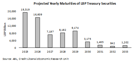 ومن المتوقّع بأن تشهد الفترة المتبقيّة من العام 2025 إستحقاق سندات بقيمة 4،585 مليار ل.ل. علماً بأنّ الأشهر التسعة الأولى من العام كانت قد شهدت إستحقاق سندات بقيمة 14،734 مليار ل.ل.، كما وبأن يشهد العامين 2026 و2027 إستحقاق سندات بقيمة 16،609 مليار ل.ل. (30.4%) و7،197 مليار ل.ل. (13.2%) بالتتالي. يظهر البيان التالي توزيع إستحقاقات سندات الخزينة اللبنانيّة خلال الفترة الممتدّة بين العامين 2025 و2033: