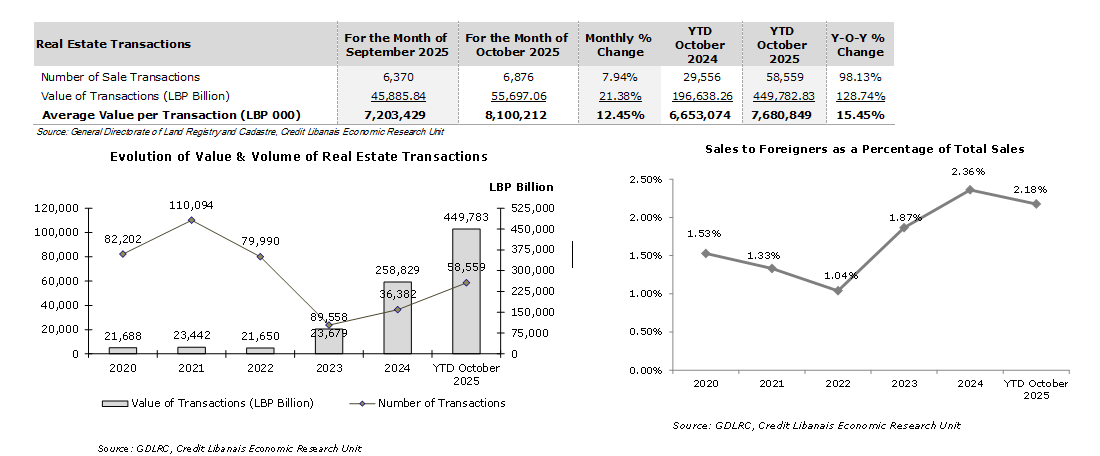 Real estate activity picked up on a monthly basis in October 2025, whether in terms of number (up by 7.94% to 6,876) or value (up by 21.38% to LBP 55.70 trillion) of transactions. The average value per transaction increased by 12.45% month-on-month to LBP 8.10 billion ($90.51K at the LBP 89,500 per USD exchange rate), from LBP 7.20 billion ($80.49K) a month earlier. It is worth noting, however, that the bulk of the work of real estate registries nowadays, and especially for those that remained most on strike (Mount Lebanon for example), is geared towards the processing of backlogged real estate transactions. As such, the figures displayed in the below section do not reflect the real momentum of the real estate sector during the concerned months. On an annual basis, the number of real estate transactions rose by 98.13% during the first ten months of the current year to 58,559 compared to 29,556 in the same period last year with the value of transactions increasing by 128.74% over the same period to LBP 449.78 trillion (around $5.03 billion). Foreigners’ share of real estate sale transactions dropped to 2.18% by October 2025 from 2.36% in the full year 2024 yet stood higher than the 1.87% reading reported in the year 2023 as shown below: