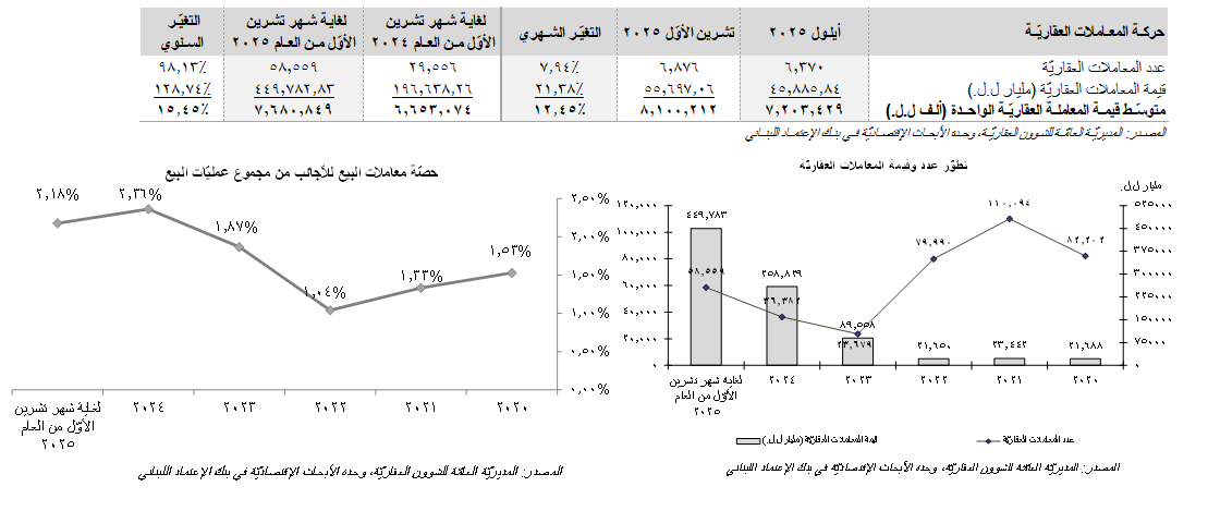إنتعشت الحركة العقاريّة خلال شهر تشرين الأوّل 2025 أكان على صعيد عدد المعاملات العقارية (إرتفاع شهريّ بنسبة 7.94% إلى 6،876) أو قيمتها (زيادة شهريّة بنسبة 21.38% إلى 55.70 تريليون ل.ل.). كذلك، إرتفع متوسّط قيمة المعاملة الواحدة بنسبة 12.45% على أساس شهري إلى 8.10 مليار ليرة لبنانّية (حوالي 90.51 ألف د.أ. على سعر صرف ال89،500 ل.ل مقابل الدولار)، من 7.20 مليار ليرة لبنانية (حوالي 80.49 ألف د.أ.) قبل شهر. وتجدر الإشارة إلى أنّ الجزء الأكبر من عمل الدوائر العقاريّة في الآونة الأخيرة، وخاصّة تلك التي أضربت لفترة طويلة مثل دوائر جبل لبنان، يكمن في معالجة المعاملات العقاريّة المتراكمة. وعليه، فإن الأرقام المبيّنة في الفقرة أدناه لا تعكس حجم المعاملات العقاريّة الفعليّ خلال الأشهر المعنيّة. على أساس سنوي، زاد عدد المعاملات العقارية بنسبة 98.13% خلال الأشهر العشرة الأولى من العام 2025 إلى 58،559 مقارنة بـ29،556 معاملة في الفترة نفسها من العام 2024 مع زيادة قيمتها بحوالي 128.74% إلى 449.78 تريليون ل.ل. (حوالي 5.03 مليار د.أ.) وقد إنكمشت حصّة الأجانب من عمليّات المبيع العقاريّة إلى 2.18% كما في نهاية شهر تشرين الأوّل 2025، من 2.36% في كامل العام 2024 علماً أنّها كانت قد إستقرّت عند 1.87% في كامل العام 2023 كما هو مبيّن أدناه: