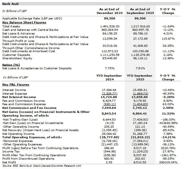 Bank Audi published its unaudited consolidated financial statements for the first nine months of 2025 reporting a net profit of LBP 8,510.53 billion (around $95.09 million) compared to LBP 2.53 billion ($28.29 thousand) in the same period last year noting that the bank commented in its consolidated financial highlights that it continues to “allocate part of consolidated operating surpluses to provisions for risk and charges”. In details, net interest income contracted by 5.20% y-o-y to reach LBP 13,958.60 billion while net commission & fee income rose by 2.59% to LBP 7,745.13 billion. The bank’s net gains on financial instruments & other operating income stood at LBP 9,864.41 billion (of which net gains on financial investments totaling LBP 17,180.24 billion ($191.96 million) and net trading losses of LBP 7,436.92 billion ($83.09 million)), up by 11.52% y-o-y when compared to the LBP 8,845.54 billion figure reported a year earlier. In addition, the bank booked some LBP 299.38 billion in impairments on financial assets compared to a much larger figure of LBP 2,055.45 billion a year earlier. Consequently, Bank Audi’s net operating income improved by 7.58% year-on-year to reach LBP 31,268.77 billion during the first nine months of 2025. Concurrently, operating expenses dropped by 24.21% year-on-year to read LBP 21,810.23 billion ($243.69 million) YTD September 2025, with personnel expenses increasing by 9.93% to LBP 7,396.01 billion ($82.64 million) and other operating expenses dropping by 36.12% to LBP 13,699.54 billion ($191.96 million). The bank highlighted that it continues to redefine its business model in Lebanon by shifting towards a cost effective digital platform mainly for individual customers while “reshaping” the branch network to service high-net-worth and corporate clients. On the balance sheet front, the bank’s consolidated assets contracted by 11.64% in the first nine months of 2025 to LBP 1,317.92 trillion ($14.73 billion) which may be attributed to the sale of its Turkish subsidiary “Odeabank”. Net loans & advances rose by 4.21% YTD September to LBP 89.79 trillion ($1.00 billion) with cash & balances with Central Banks remaining almost flat at LBP 864.00 trillion ($9.65 billion). Customer deposits at Bank Audi rose by 2.16% in the first nine months of 2025 to LBP 1,135.28 trillion ($12.68 billion). Consequently, the bank’s ratio of net loans to customer deposits ended the first nine months of 2025 up at 7.91% from 7.75% at end of 2024. Bank Audi’s shareholders’ equity ended the month of September 2025 up by 12.48% at LBP 96.12 trillion ($1.07 billion) of which foreign currency translation reserves of LBP 52.05 trillion ($581.55 million), accumulated profit of LBP 12.98 trillion ($145.05 million; including interim profit) and real estate revaluation gains of LBP 19.11 trillion ($213.53 million).