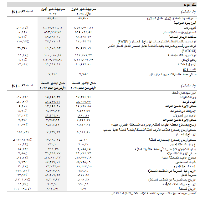أصدر بنك عودة بياناته الماليّة المجمّعة غير المدقّقة عن الأشهر التسعة الأولى من العام 2025 والتي تظهر أرباح صافية بقيمة 8،510.53 مليار ل.ل. (95.09 مليون د.أ.) مقارنةً مع أرباح بلغت 2.53 مليار ل.ل. (28.29 ألف د.أ.) في الفترة نفسها من العام السابق مع العلم أنّ المصرف قد أفاد أنّه لا زال يواصل سياسته بتخصيص جزء من الفوائض التشغيليّة المجمّعة إلى مؤونات لمواجهة الأخطار والأعباء. بالأرقام، تراجع صافي الإيرادات من الفوائد بنسبة 5.20% على أساس سنوي ليبلغ 13،958.60 مليار ل.ل. مع نهاية شهر أيلول 2025 فيما إرتفع صافي الإيرادات من العمولات بنسبة 2.59% إلى 7،745.13 مليار ل.ل. وقد إرتفعت أرباح المصرف الصافية على محفظة الأدوات الماليّة والإيرادات التشغيليّة الأخرى بنسبة 11.52% إلى 9،864.41 مليار ل.ل. (منها أرباح إستثمارات ماليّة صافية بقيمة 17،180.24 مليار ل.ل. (191.96 مليون د.أ.) وخسائر صافية عن عمليّات أدوات ماليّة مصنّفة بالقيمة العادلة مقابل حساب الأرباح أو الخسائر بقيمة 7،436.92 مليار ل.ل. (83.09 مليون د.أ.)). وقد سجّل المصرف مؤونات على محفظة الأدوات الماليّة بقيمة 299.38 مليار ل.ل. خلال الأشهر التسعة الأولى من العام 2025 مقارنةً بمؤونات بقيمة 2،055.45 مليار ل.ل. في الفترة نفسها من العام 2024. نتيجةً لذلك، إرتفعت الأرباح التشغيليّة الصافية للمصرف بنسبة 7.58% على أساس سنوي إلى 31،268.77 مليار ل.ل. في حين وتراجعت الأعباء التشغيليّة بنسبة 24.21% إلى 21،810.23 مليار ل.ل. (243.69 مليون د.أ.) خلال الأشهر التسعة الأولى من العام 2025 حيث إرتفعت أعباء المستخدمين بنسبة 9.93% إلى 7،396.01 مليار ل.ل. (82.64 مليون د.أ.) وتراجعت الأعباء التشغيليّة الأخرى بنسبة 36.12% إلى 13،699.54 مليار ل.ل. (191.96 مليون د.أ.). في هذا السياق، أشار البنك إلى أنه يواصل تعديل نموذج نشاطه المصرفي في لبنان من خلال تحويل النشاط المصرفي للأفراد إلى منصّة رقميّة ذات كلفة أقلّ وإعادة هيكلة شبكة الفروع من أجل التركيز على توفير خدمة ذات فعالية أكبر لكبار العملاء والشركات. أمّا لناحية الميزانيّة المجمَّعة، فقد تراجع مجموع أصول المصرف بنسبة 11.64% في الأشهر التسعة الأولى من العام 2025 إلى حوالي 1،317.92 ترليون ل.ل. (14.73 مليار د.أ.). يمكن تعليل هذا التراجع بقيام المصرف ببيع مصرفه التابع في تركيا (Odeabank). وقد إرتفعت محفظة التسليفات الصافية بنسبة 4.21% في الأشهر التسعة الأولى من العام 2025 إلى 89.79 ترليون ل.ل. (1.00 مليار د.أ.) فيما بقي رصيد الصندوق ومؤسّسات الإصدار شبه مستقرّ عند 864.00 ترليون ل.ل. (9.65 مليار د.أ.). وقد زادت ودائع الزبائن لدى المصرف بنسبة 2.16% إلى 1،135.28 ترليون ل.ل. (12.68 مليار د.أ.) لترتفع نسبة التسليفات الصافية من ودائع الزبائن من 7.75% مع نهاية العام 2024 إلى 7.91% مع نهاية شهر أيلول 2025. وقد زادت الأموال الخاصّة للمصرف بنسبة 12.48% في الأشهر التسعة الأولى من العام الحالي إلى 96.12 ترليون ل.ل. (1.07 مليار د.أ.) من ضمنها إحتياطات فروقات تحويل العملات الأجنبيّة بقيمة 52.05 ترليون ل.ل. (581.55 مليون د.أ.) وأرباح مدوّرة بقيمة 12.98 ترليون ل.ل. (145.05 مليون د.أ.؛ وهي تشمل أرباح الدورة الماليّة من العام الحالي) وربح تحسين على عمليّة إعادة تقييم العقارات بقيمة 19.11 ترليون ل.ل. (213.53 مليون د.أ.).