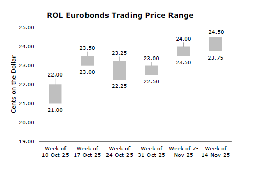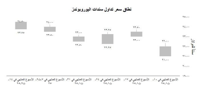 بقي النشاط على سندات اليوروبوندز خجولاً خلال الأسبوع مع إستقرار الأسعار عند مستوى 23.75-24.25 سنتاً للدولار في ظل ترقّب المستثمرين لنتائج مؤتمر "Beirut One" المزمع عقده خلال الأسبوع المقبل. إلّا أنّ مشاركة عدد من المستثمرين العرب والدوليين البارزين في المؤتمر تُمثل مؤشّر جيّد على حجم الإستثمارات الأجنبيّة المباشرة المحتملة التي يمكن إستقطابها خلال المؤتمر. وقد شهدت نهاية الأسبوع بعض الإقبال من المستثمرين الدوليين ما رفع الأسعار إلى مستوى ال23.75 – 24.50 سنتاً للدولار.