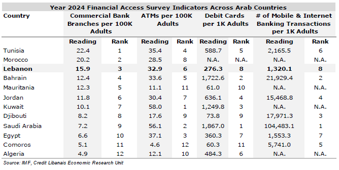 The International Monetary Fund (IMF) recently released its 2025 Financial Access Survey (FAS) results, a dataset that includes annual statistics on financial service access and usage, covering figures for the year 2024. In figures, Tunisia ranked first amongst covered Arab countries in terms of commercial bank branches per 100,000 (100K) adults at end of year 2024 with a reading of 22.4 followed by Morocco (20.2 branches) and Lebanon (15.9 branches), bearing in mind that Lebanon occupied the first place amongst Arab countries prior to the year 2020, i.e. before the onset of the financial crisis. In addition, the FAS results showed that while Bahrain, Kuwait and Saudi Arabia ranked 4th, 7th and 9th among Arab countries in terms of branches per 100K adults, the performance of said GCC countries was much better in terms of relative electronic banking benchmarks (ATMs, debit cards and mobile & internet banking transactions) highlighting the shift to digital banking. In figures, Kuwait ranked first in terms of ATMs per 100K adults in 2024 with a reading of 58.0, followed by Saudi Arabia (56.1) and Egypt (37.1), with Lebanon ranking 6th (pre-crisis ranking of 5) with a reading of 32.9. Saudi Arabia occupied the first place among Arab countries in terms of debit cards per 1,000 (1K) adults with a reading of 1,867.0, followed by Bahrain (1,722.6 per 1K adults) and Kuwait (1,249.8 per 1K adults), with Lebanon ranking 8th (pre-crisis ranking of 6) with a reading of 276.3 debit cards per 1K adults. Saudi Arabia also outperformed its Arab peers in terms of mobile & internet transactions with a level of 104,483.1 transactions per 1K adults during the year 2024, way ahead of Bahrain (21,929.4) which ranked second and Djibouti (17,971.3) which ranked third. Lebanon, however, bottomed the list (pre-crisis ranking not comparative due to lack of available data for several Arab countries) with 1,320.1 transactions per 1K adults.