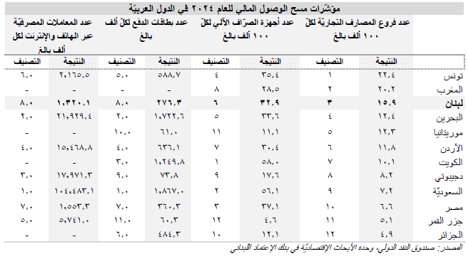 أصدر صندوق النقد الدولي مؤخرًا نتائج مسح الوصول المالي للعام 2025، وهو عبارة عن مجموعة بيانات تتضمن إحصاءات سنوية حول الوصول إلى الخدمات المالية وإستخدامها، علماً بأنّ هذا المسح يغطّي أرقام العام 2024. وبالأرقام، إحتلّت تونس المرتبة الأولى بين الدول العربيّة المشمولة من حيث عدد فروع المصارف التجاريّة لكل 100 ألف بالغ بنهاية العام 2024، بمعدّل 22.4 فرعاً، تلاها المغرب (20.2 فرعاً) ولبنان (15.9 فرعاً)، علماً بأنّ لبنان كان يحتلّ المرتبة الأولى بين الدول العربيّة قبل العام 2020 أي قبل اندلاع الأزمة الماليّة. بالإضافة إلى ذلك، أظهرت نتائج المسح المالي أنّه بينما إحتلّت البحرين والكويت والمملكة العربية السعوديّة المراتب الرابعة والسابعة والتاسعة بين الدول العربيّة من حيث عدد فروع المصارف التجاريّة لكل 100 ألف بالغ، كان أداء هذه الدول أفضل بكثير من حيث المعايير النسبيّة للخدمات المصرفيّة الإلكترونيّة (أجهزة الصراف الآلي، وبطاقات الدفع، والمعاملات المصرفيّة عبر الهاتف المحمول والإنترنت)، مما يُظهر التحوّل إلى من الصيرفة الكلاسيكيّة إلى الصيرفة الإلكترونيّة. بالأرقام، إحتلّت الكويت المرتبة الأولى من حيث عدد أجهزة الصرّاف الآلي لكل 100 ألف بالغ في العام 2024 بمعدّل 58.0، تلتها المملكة العربيّة السعوديّة (56.1) ومصر (37.1)، بينما إحتلّ لبنان المرتبة السادسة (التصنيف الخامس قبل الأزمة) بمعدل 32.9 صراف آلي لكل 100،000 بالغ. وقد إحتلّت المملكة العربيّة السعوديّة المرتبة الأولى بين الدول العربيّة من حيث بطاقات الدفع لكل 1000 بالغ بمعدّل 1،867.0 تلتها البحرين (1،722.6 لكل 1000 بالغ) والكويت (1،249.8 لكل 1000 بالغ)، مع إحتلال لبنان المرتبة الثامنة (التصنيف السادس ما قبل الأزمة) بنتيجة 276.3 لكل ألف بالغ. كما إحتلّت المملكة العربية السعوديّة المرتبة الأولى عربيّاً من حيث عدد المعاملات المصرفيّة عبر الهاتف المحمول والإنترنت لكل 1000 بالغ، بمستوى 104،483.1 خلال العام 2024، متقدّمة بشكل كبيرعلى البحرين (21،929.4 معاملة( ودجيبوتي (17،971.3 معاملة(، مع إحتلال لبنان المرتبة الأخيرة (تصنيف ما قبل الأزمة لا يمكن إعتماده بسبب نقص البيانات المتاحة للعديد من الدول العربية) بـ 1،320.1 معاملة لكل 1000 بالغ.