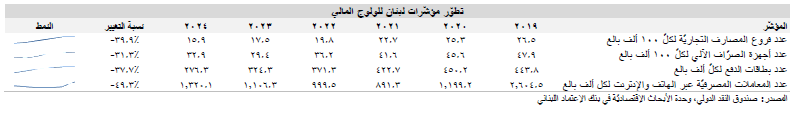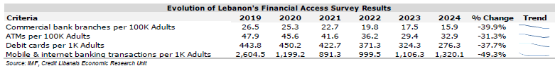 يُبيّن الجدول أدناه التأثير السلبي للأزمة الماليّة التي عصفت بالبلاد على القطاع المصرفي اللبناني، حيث إنخفض عدد فروع المصارف التجاريّة وأجهزة الصرّاف الآلي لكل 100 ألف بالغ بنسب تقارب ال40% وال31% منذ بداية الأزمة، ليصل إلى 15.9 و32.9 على التوالي، مقارنةً بـ 26.5 و47.9 قبل الأزمة. بالتفاصيل فقد إضطرّت المصارف إلى تقليص شبكة فروعها وعدد أجهزة الصرّاف الآلي لخفض نفقات الإيجار ونفقات التشغيل، إلّا أنّ الأثر على شبكة أجهزة الصرّاف الآلي كان أقلّ وطأةً نظراً لإنخفاض كلفتها مقارنةً بكلفة الفروع. وفي موازاة ذلك، بدأت المصارف في التحوّل إلى تقديم خدمات مصرفية إلكترونية أقلّ كلفةً وأسهل إستخداماً، مما يُفسّر الارتفاع المضطرد (32.1%) في معاملات الخدمات المصرفيّة عبر الهاتف المحمول والإنترنت لكل ألف بالغ بين عاميّ 2022 و2024، ليصل إلى حوالي 1،320 معاملة.
