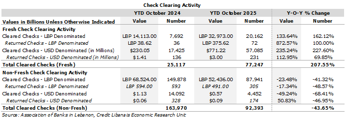 Fresh check clearing activity pursued its positive momentum with the total number of checks more than tripling to ~77.25K in the first ten months of 2025 from ~25.12K in the same period last year. In addition, statistics are showing a much higher prevalence for fresh denominated checks, with their contribution increasing from 13.28% of total clearing activity YTD October 2024 (LBP contribution of 4.88% and USD contribution of 55.29%) to 45.54% in the same period in 2025 (18.65% for LBP & 92.77% for USD). In details, the total number of fresh LBP-denominated checks rose from 7,692 during the first ten months of 2024 to 20,162 a year later, with their value rising by 133.64% to LBP 32,973 billion. Similarly, the total number of fresh USD-denominated checks rose from 17,425 YTD October 2024 to 57,085 YTD October 2025, with the value of these checks increasing exponentially to $771.22 million from $230.05 million in the same period in 2024. Of the total number of fresh cleared checks, 73.90% was denominated in foreign currency, versus 69.38% a year before.