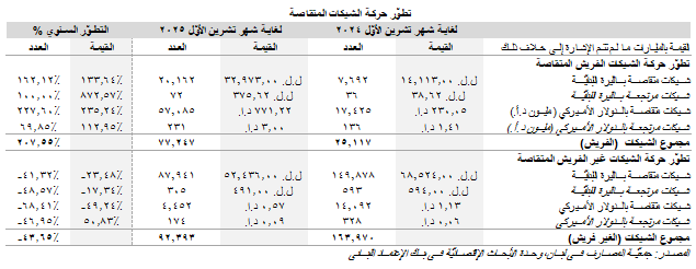 وقد إنخفضت قيمة الشيكات غير الفريش بالليرة بنسبة 23.48% على أساس سنوّي إلى 52،436 مليار ليرة لبنانيّة (موزعة على 87،941 شيكاً) في الأشهر العشرة الأولى من العام 2025 مقارنة ب68،524 مليار ليرة لبنانيّة (موزعة على 149،878 شيكاً) في الفترة نفسها من العام 2024. كذلك إنخفضت قيمة الشيكات غير الفريش المعنونة بالدولار الأميركي بنسبة 49.24% على أساس سنويّ إلى 571 مليون د.أ. (موزعة على 4،452 شيكاً) مقارنة ب1،125 مليون د.أ. (موزعة على 14،092 شيكاً) في الفترة نفسها من العام 2024. وقد شكّلت الشيكات المعنونة بالعملة المحليّة 95.18% من إجمالي عدد الشيكات غير الفريش مقابل 91.41% في الفترة ذاتها من العام السابق.