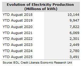 تراجع إنتاج الكهرباء في لبنان بنسبة 3.61% خلال شهر آب من العام 2025 إلى 480 مليون كيلوواط ساعة، مقابِل 498 مليون كيلوواط ساعة في شهر تمّوز. أمّا على صعيدٍ سنويّ، فقد زاد إنتاج الكهرباء بنسبة 25.58% إلى 3،491 مليون كيلوواط ساعة في الأشهر الثمانية الأولى من العام 2025 مقارنةً ب2،780 مليون كيلوواط ساعة في الفترة نفسها من العام 2024.