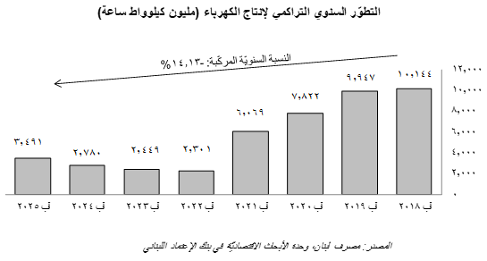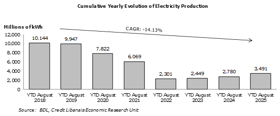 يُظهِر البيان التالي أنّ نسبة النموّ السنوي المركَّب (Compounded Annual Growth Rate) لإنتاج الكهرباء كانت سلبيّةً عند حوالي 14.13% خلال الفترة الممتدّة بين شهريّ آب 2018 وآب 2025 كما هو مبيّن أدناه: