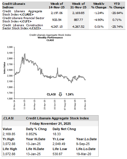Five losing and two gaining stocks were screened week-on-week, dragging the BSE’s market capitalization down by 1.20% to around $19.90 billion and the Credit Libanais Aggregate Stock Index (“CLASI”) lower by 1.24% to 2,169.85.