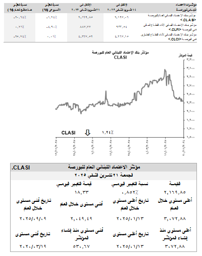 إنتعشت حركة التداول على بورصة بيروت في الأسبوع المنتهي في 21 تشرين الثاني حيث إرتفع عدد الأسهُم المتداوَلة إلى 180،702 سهم، مقارنةً ب75،523 سهم في الأسبوع الذي سبقه كما وزادت قيمة الأسهم المتداولة إلى 4.40 مليون د.أ.، مقارنةً ب2.85 مليون د.أ. قبل أسبوع. وقد سَيطَرَت أسهُم القطاع المصرفي على الحصّة الأكبر من حجم التداول مشكّلةً نسبة 71.36% من مجموع عدد الأسهم المتداولة.