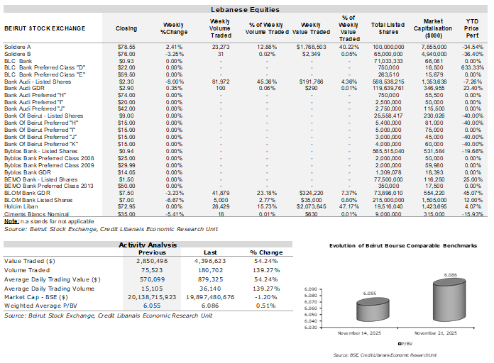 Activity on the Beirut Stock Exchange (BSE) rebounded during the week of November 21 with the number of shares changing hands increasing to 180,702 shares compared to 75,523 shares in the week before and value traded rising to $4.40 million compared to $2.85 million a week earlier. Trades were concentrated in banking sector stocks, which accounted for 71.36% of weekly traded volume.