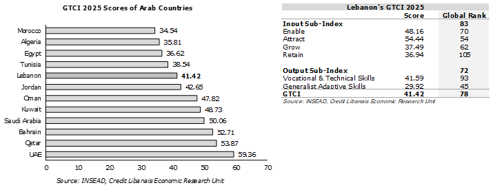 The INSEAD 2025 GTCI report is made up of 77 indicators and covers 135 countries, which together represent more than 97% of global GDP and 93% of the world’s population. In detail, and on a global level, Singapore came in first in the world in the 2025 GTCI with a score of 73.29, followed by Switzerland (score: 73.14), Denmark (score: 72.05), Finland (score: 71.06) and Sweden (score: 70.76) among others. On a regional basis, the United Arab Emirates came first in the GTCI 2025 rankings of Arab countries with a score of 59.36 (global rank: 25), followed by Qatar (score: 53.87; global rank: 35), Bahrain (score: 52.71; global rank: 38), and Saudi Arabia (score: 50.06; global rank: 48), only to name a few. Lebanon scored 41.42 in the GTCI 2025, placing it in the 8th position among its Arab peers and 78th in the world. In detail, Lebanon ranked 83rd globally in the Input Sub-Index and 72nd in the Output Sub-Index. On the Input Sub-Index front, Lebanon ranked 70th in the world in the talent enabling pillar (score: 48.16), 54th in the talent attraction pillar (score: 54.44), 62nd in the talent growth pillar (score: 37.49), and 105th in the talent retention pillar (score: 36.94). With respect to the Output Sub-Index, Lebanon positioned 93rd in the “Vocational and Technical Skills” criterion (score: 41.59) and 45th in the “Generalist Adaptive Skills” criterion (score: 29.92). Lebanon’s best performance on the “Enable” front was in the field of Enterprise Software (score: 100; global rank: 1), on the “Attract” front in the field of Financial Globalization (score: 83.62; global rank: 21), on the “Grow” front in the field of Use of Virtual Networks (score: 68.24; global rank: 62), on the “Retain” front in the field of Sanitation (score: 99.08; global rank: 28), on the “Vocational & Technical Skills” front in the field of Ease of Finding Skilled Employees (score: 73.66; global rank: 5), and on the “Generalist Adaptive Skills” front in the field of Mobile Apps Development (score: 72.70; global rank: 27).