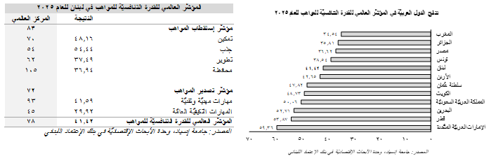 يتألّف تقرير جامعة إنسياد للعام 2025 من 77 مؤشّر وهو يشمل 135 دولة تشكّل أكثر من 97% من الناتج المحلّي الإجمالي العالمي و93% من عدد سكّان العالم. بالتفاصيل، وعلى الصعيد العالمي، حلّت سنغافورة في المرتبة الأولى في المؤشّر العالمي للقدرة التنافسيّة للمواهب عن العام 2025 بنتيجة 73.29، تبعتها سويسرا (النتيجة: 73.14) والدنمارك (النتيجة: 72.05) وفنلندا (النتيجة: 71.06) والسويد (النتيجة: 70.76). إقليميّاً، جاءت دولة الإمارات العربيّة المتحّدة في المركز الأوَّل في المؤشّر العالمي للقدرة التنافسيّة للعام 2025 مُسجِّلةً نتيجة 59.36 (المركز العالمي: 25)، تَبِعَتها كلٌّ من قطر (النتيجة: 53.87؛ المركز العالمي: 35) والبحرين (النتيجة: 52.71؛ المركز العالمي: 38) والمملكة العربيّة السعوديّة (النتيجة: 50.06؛ المركز العالمي: 48) للذكر لا للحصر. أمّا بالنسبة للبنان، فقد سجّل هذا الأخير نتيجة 41.42 في المؤشّر المذكور ليحتلّ بذلك المركز الثامن عربيّاً والمركز ال78 عالميّاً. بالتفصيل، جاء لبنان في المرتبة 83 عالميّاً في مؤشّر إستقطاب المواهب والمركز 72 في مؤشّر تصدير المواهب. وعلى صعيد مؤشّر إستقطاب المواهب، إحتلّ لبنان المركز ال70 في العالم في عامل تمكين المواهب (النتيجة: 48.16) و54 في عامل جذب المواهب (النتيجة: 54.44) و62 في عامل تطوير المواهب (النتيجة: 37.49) و105 في عامل المحافظة على المواهب (النتيجة: 36.94). وفيما يختصّ بمؤشّر تصدير المواهب، جاء لبنان في المرتبة 93 عالميّاً في عامل المهارات المهنيّة والتقنيّة (النتيجة: 41.59) وال45 في عامل المهارات التكيفيّة العامّة (النتيجة: 29.92). بالإضافة إلى ذلك، سجّل لبنان أداءه الأفضل على صعيد "التمكين" في مجال برمجيّات المؤسّسات (النتيجة: 100؛ المركز العالمي: 1) وعلى صعيد "الجذب" في مجال العولمة الماليّة (النتيجة: 83.62؛ المركز العالمي: 21) وعلى صعيد "التطوير" في مجال إستعمال الشبكات الإفتراضيّة (النتيجة: 68.24؛ المركز العالمي: 62) وفي ما خصّ "المُحافظة" في مجال الصرف الصحّي (النتيجة: 99.08؛ المركز العالمي: 28) وعلى صعيد "المهارات المهنيّة والتقنيّة" في مجال سهولة العثور على موظّفين ذوي مهارة عالية (النتيجة: 73.66؛ المركز العالمي: 5) وفي إطار "المهارات التكيفيّة العامّة" في مجال تطوير تطبيقات الهاتف المحمول (النتيجة: 72.70؛ المركز العالمي: 27).