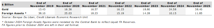 تُظهِر ميزانيّة مصرف لبنان إنخفاض في الموجودات الخارجيّة بالعملات الأجنبيّة بمبلغٍ قدره 129.35 مليون د.أ. (1.08%) خلال النصف الثاني من شهر تشرين الثاني 2025 إلى 11.85 مليار د.أ. (1،060.50 ترليون ل.ل.)، مقارنةً مع 11.98 مليار د.أ. (1،072.08 ترليون ل.ل.) قبل فترة أسبوعين. يجدر الذكر أنّ الموجودات الخارجيّة بالعملات الأجنبيّة لدى مصرف لبنان قد شهدت زيادة مضطردة خلال الفترة الممتدّة بين بداية شهر آب 2023 (أيّ عند نهاية ولاية الحاكم السابق رياض سلامة) ونهاية شهر تشرين الثاني 2025 بلغت قيمتها الإجماليّة حوالي 3.28 مليار د.أ. عقب سياسة مصرف لبنان النقديّة الجديدة القاضية بالإمتناع عن تسليف الحكومة ورفع الدعم عن معظم السلع والحدّ من طبع العملة المحليّة. في السياق عينه، زادت الموجودات الخارجيّة بالعملات الأجنبيّة لدى مصرف لبنان بحوالي 1.71 مليار د.أ. منذ مطلع العام الحالي. من جهةٍ أخرى، تُبيِّن ميزانيّة مصرف لبنان تراجع في قيمة إحتياطاته من الذهب بلغت نسبتها 0.17% (65.66 مليون د.أ.) في النصف الثاني من شهر تشرين الثاني 2025 إلى 38.40 مليار د.أ. (3،347.07 ترليون ل.ل.) في ظلّ إنخفاض أسعار الذهب عند مقارنتها بأرقام منتصف شهر تشرين الثاني بالرغم من التصحيح الإيجابي في أسعار الذهب خلال النصف الثاني من الشهر على إثر إرتفاع أقلّ من المتوقّع لأرقام مبيعات التجزئة في الولايات المتّحدة عن شهر أيلول، ما عزّز التوقّعات أن يقوم الفدرالي الأميركي بخفض معدّلات الفوائد في شهر كانون الأوّل.