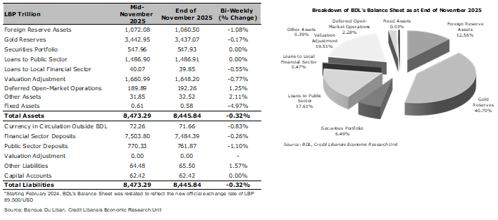 The Lebanese Central Bank’s balance sheet conveys a $129.35 million (1.08%) contraction in the foreign reserve assets portfolio during the second half of November 2025 to $11.85 billion (LBP 1,060.50 trillion), down from $11.98 billion (LBP 1,072.08 trillion) two weeks earlier. It is worth noting that foreign reserve assets at BDL saw a sharp $3.28 billion increase between the beginning of August 2023 (end of the mandate of previous Central Bank Governor Riad Salameh) and end of November 2025 period as a result of the new monetary policy of the Central Bank which refrains from financing the government, lifted subsidies, and limited the printing of the local currency. In the same vein, foreign reserve assets at BDL rose by $1.71 billion since the beginning of the current year. Similarly, the value of gold reserves at BDL decreased by 0.17% ($65.66 million) in the second half of November to $38.40 billion (LBP 3,437.07 trillion) as gold prices dropped compared to their level recorded in mid-November yet showed some correction throughout the second half of November as the lower than expected increase in US retail sales data for the month of September reinforced expectations that the Federal Reserve will cut interest rates in December.