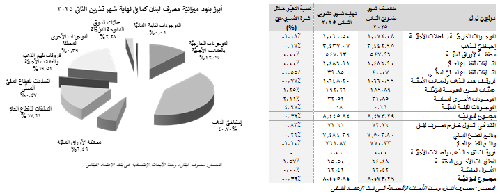 في هذا الإطار، شكّل إحتياطيّ الذهب حصّة 40.70% من مجموع أصول مصرف لبنان كما في نهاية شهر تشرين الثاني 2025 فيما بلغت حصّة الموجودات الخارجيّة بالعملات الأجنبيّة 12.56%، مقارنةً بنسب بلغت 40.63% و12.65% بالتتالي لكلٍّ منهما قبل فترة أسبوعين.
