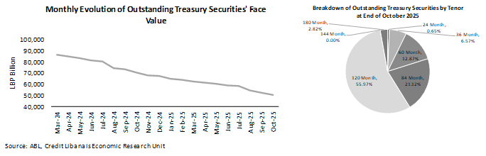 According to the ABL’s monthly Treasury Bills publication, the face value of the outstanding LBP treasury securities’ portfolio fell by 4.17% in October 2025 to LBP 50,245 billion, down from LBP 52,431 billion a month earlier, with the balance of outstanding treasury securities that matured since the beginning of the year 2025 and up until October reaching LBP 16,920 billion. In this respect, the outstanding face value of LBP treasury securities dropped by 28.73% year-on-year when compared to the LBP 70,498 billion outstanding level at end of October of the previous year. The continuous drop in the outstanding balance of the face value of the treasury securities portfolio may be explained by the Ministry of Finance’s decision to suspend the issuance of new securities since December 2023. It is worth highlighting that 55.97% of the outstanding treasury securities’ portfolio had a tenor of 120 months as at end of October 2025, followed by the 84 month (21.12%), 60 month (12.87%) and 36 month (6.57%) tenor securities.
