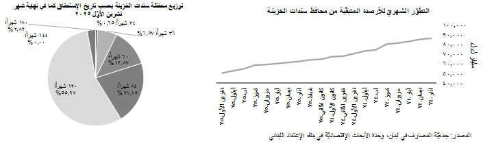 بحسب إحصاءات جمعيّة المصارف، تراجع رصيد محفظة سندات الخزينة بنسبة 4.17% في شهر تشرين الأوّل 2025 إلى 50،245 مليار ل.ل. من 52،431 مليار ل.ل. في شهر أيلول ليصل رصيد سندات الخزينة المستحقّ منذ بداية العام 2025 ولغاية شهر تشرين الأوّل إلى 16،920 مليار ل.ل. بذلك، تكون قد تراجعت محفظة سندات الخزينة القائمة على صعيد سنويّ بنسبة 28.73% من 70،498 مليار ل.ل. في شهر تشرين الأوّل من العام السابق. ويأتي هذا التراجع المستمرّ في القيمة الإسميّة لهذه المحفظة في ظلّ توقّف وزارة المال عن إصدار سندات جديدة منذ شهر كانون الأول 2023. وقد شكّلت سندات الخزينة التي تبلغ مدّة إستحقاقها 120 شهراً حصّة الأسد (55.97%) من الرصيد المتبقّي لسندات الخزينة بالليرة اللبنانيّة كما في نهاية شهر تشرين الأوّل 2025، تلتها تلك من فئة ال84 شهراً (حصّة 21.12%) وتلك من فئة ال60 (12.87%) وال36 (6.57%) شهراً للذكر لا للحصر.