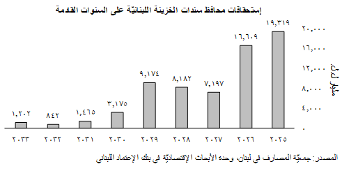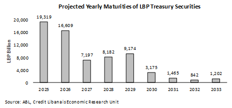 ومن المتوقّع بأن تشهد الفترة المتبقيّة من العام 2025 إستحقاق سندات بقيمة 2،399 مليار ل.ل. علماً بأنّ الأشهر العشرة الأولى من العام كانت قد شهدت إستحقاق سندات بقيمة 16،920 مليار ل.ل.، كما وبأن يشهد العامين 2026 و2027 إستحقاق سندات بقيمة 16،609 مليار ل.ل. (30.4%) و7،197 مليار ل.ل. (13.2%) بالتتالي. يظهر البيان التالي توزيع إستحقاقات سندات الخزينة اللبنانيّة خلال الفترة الممتدّة بين العامين 2025 و2033: