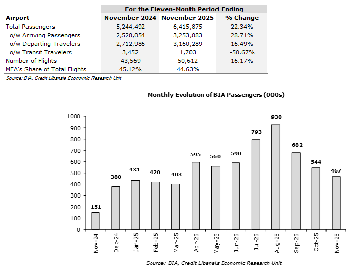 The number of passengers via the Beirut International Airport (BIA) stood at 467,099 in November 2025, down by 14.18% month-on-month from 544,253 in October yet came in 209.19% higher y-o-y when compared to November 2024’s reading of 151,073 as a result of the Israeli aggression on Lebanon in the last quarter of 2024. The ratio of departing to arriving passengers stood at 1.09x in November compared to 1.07X in October, 1.30x in September and 1.34x in August. On a cumulative basis, however, the number of BIA passengers rose by 22.34% y-o-y in the first eleven months of 2025 to around 6.42 million, up from 5.24 million passengers in the same period in 2024. More specifically, the number of arriving travelers decreased by 15.16% m-o-m while increasing by 28.71% on an annual basis to 3.25 million YTD November, with the number of departing travelers ebbing by 13.27% m-o-m yet increasing by 16.49% y-o-y to 3.16 million. The number of transit travelers increased by 17.82% m-o-m while dropping by 50.67% y-o-y up to November 2025 to 1,703 when compared to last year’s figure of 3,452. As to the number of flights, the latter saw a monthly decrease of 4.09% in November and an annual rise of 16.17% during the first eleven months of 2025 to 50,612. It is worth highlighting in this context that the share of Middle East Airlines (MEA) dropped from 45.12% of the total number of flights in the first eleven months of 2024 to 44.63% in the same period in 2025. This is further sketched in the section below: