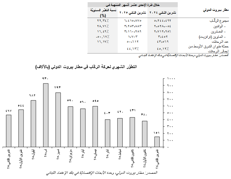 إنخفض عدد المسافرين عبر مطار بيروت الدولي بنسبة 14.18% في شهر تشرين الثاني 2025 إلى 467،099 مقابل 544،253 في تشرين الأوّل في حين زاد هذا العدد بنسبة سنويّة بلغت 209.19% مقارنةً بالمستوى المسجّل خلال شهر تشرين الثاني 2024 والبالغ حينها 151،073 وذلك بسبب العدوان الإسرائيلي على لبنان في الفصل الأخير من العام السابق. وقد وصل معدّل المسافرين المغادرين كنسبةً من المسافرين القادمين إلى حوالي ال1.09 في تشرين الثاني مقارنةً ب1.07 في تشرين الأوّل و1.30 في أيلول و1.34 في آب. على صعيد تراكمي، إرتفع عدد المسافرين بنسبة 22.34% سنويّاً في الأشهر الإحدى عشر الأولى من العام 2025 إلى حوالي 6.42 مليون مسافر مقارنةً بحوالي 5.24 مليون مسافر في الفترة نفسها من العام 2024. في التفاصيل، تراجع عدد الوافدين إلى لبنان بنسبة 15.16% على أساس شهريّ في حين زاد بنسبة 28.71% على أساسٍ سنويٍّ إلى 3.25 مليون مسافر حتّى شهر تشرين الثاني الحالي. بالإضافة إلى ذلك، إنكمش عدد المغادرين بنسبة 13.27% على صعيد شهريّ في حين إرتفع بنسبة 16.49% على صعيد سنوي إلى 3.16 مليون مسافر في نهاية الأشهر الإحدى عشر الأولى من العام 2025. وقد إرتفع عدد العابرين عبر مطار بيروت (ترانزيت) بنسبة 17.82% على صعيد شهريّ في حين سجّل إنخفاضاً نسبته 50.67% على أساس سنويّ إلى 1،703 مسافر حتّى شهر تشرين الثاني 2025. أمّا فيما يخصّ حركة الملاحة، فقد سجّل عدد الرحلات الجويّة إنخفاض شهريّ بلغت نسبته 4.09% في تشرين الثاني وزيادة سنويّة بلغت نسبتها 16.17% خلال فترة الأشهر الإحدى عشر الأولى من العام 2025 إلى 50،612. يجدر الذكر أنّ حصّة طيران الشرق الأوسط من إجمالي عدد الرحلات قد تراجعت من 45.12% في نهاية شهر تشرين الثاني من العام 2024 إلى 44.63% في الفترة الموازية من العام 2025 كما هو مبيّن أدناه: