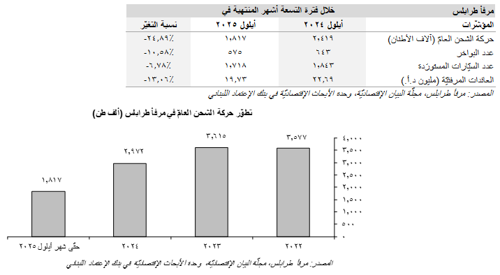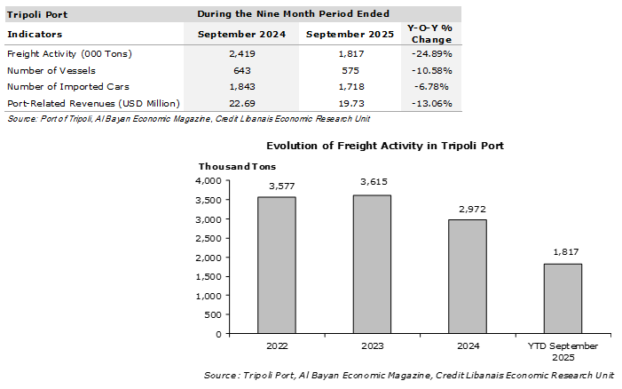 تحسّنت حركة الشحن العامّ عبر مرفأ طرابلس خلال الشهر التاسع من العام 2025 حيث زاد الوزن الإجمالي للبضائع إلى 229 ألف طن في شهر أيلول مقابل حوالي 214 ألف طن في شهر آب (إرتفاع شهريّ نسبته 7.01%). في التفاصيل، شَكَّلَت الشحنات الوارِدة 75.11% (172 ألف طن) من الوزن الإجمالي للبضائع، في حين بلغت نسبة الحمولات المصدَّرة 24.89% (57 ألف طن). أمّا على صعيدٍ تراكميٍّ، فقد تراجع الوزن الإجمالي للبضائع المشحونة عبر مرفأ طرابلس بنسبة سنويّة بلغت 24.89% إلى 1،817 ألف طن في الأشهر التسعة الأولى من العام 2025 مقارنةً ب2،419 ألف طن خلال الفترة نفسها من العام 2024. بالتوازي، إنخفض عدد البواخر بنسبة 10.58% على أساس سنويّ إلى 575 باخرة كما وتراجع عدد السيّارات المستوردة ب125 (6.78%) إلى 1،718 سيّارة مقارنةً ب1،843 سيّارة خلال الفترة نفسها من العام 2024. أمّا في ما يخصّ العائدات المرفئيّة لمرفأ طرابلس، فقد إنكمشت هذه الأخيرة بنسبة سنويّة قدرها 13.06% إلى 19.73 مليون د.أ. حتّى شهر أيلول 2025 مقارنةً ب22.69 مليون د.أ. في الفترة نفسها من العام 2024.