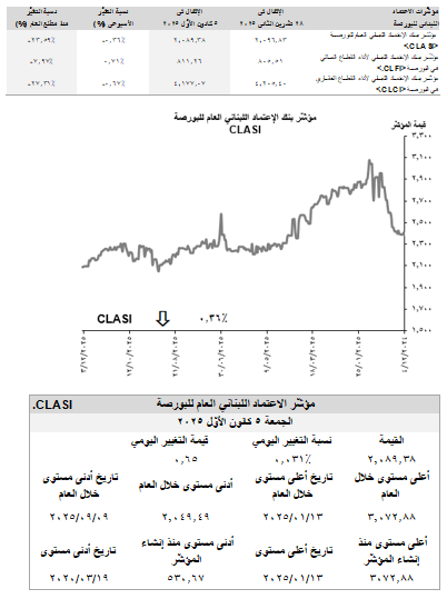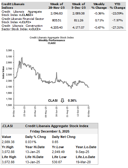 من جهةٍ أخرى، إنخفضت الرسملة السوقيّة (Market Capitalization) لبورصة بيروت بنسبة 0.34% على صعيد أسبوعي إلى حوالي 19.19 مليار د.أ.، وذلك في ظلّ التراجع في أسعار أربعة أسهم والتحسّن في سعر سهمين آخرين. في هذا الإطار، أنهى مؤشِّر بنك الإعتماد اللبناني للبورصة (“CLASI”) أسبوعه على إنخفاض بنسبة 0.36% عن إقفال الأسبوع السابق ليصل إلى 2،089.38.