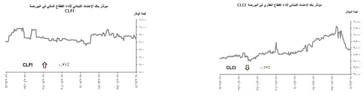 أمّا في القطاع المصرفي، فقد إستحوذت شهادات الإيداع التابعة لبنك لبنان والمهجر على حصّة الأسد (41.16%) من مجموع عدد الأسهُم المتداوَلة خلال الأسبوع المعني. من جهته، أنهى مؤشِّر بنك الإعتماد اللبناني لأداء القطاع المالي في البورصة (“CLFI”) أسبوعه متحسّناً بنسبة 0.71% عن إقفال الأسبوع السابق عند مستوى 811.26 في ظلّ إرتفاع سعر الأسهم العاديّة التابعة لبنك عوده بنسبة 4.71% إلى 2.00 د.أ. وزيادة سعر الأسهم العاديّة التابعة لبنك لبنان والمهجر بنسبة 2.86% إلى 7.20 د.أ. ما طغى على إنخفاض سعر شهادات الإيداع التابعة لبنك لبنان والمهجر بنسبة 8.19% إلى 6.50 د.أ. وتراجع سعر الأسهم العاديّة التابعة لبنك بيبلوس بنسبة 6.35% إلى 0.59 د.أ.