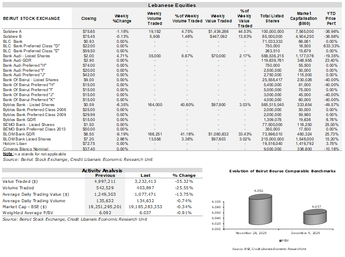 Activity on the Beirut Stock Exchange (BSE) lost steam during the week of December 5 with the number of shares changing hands decreasing to 403,897 shares compared to 542,529 shares in the week before and value traded dropping to $3.23 million compared to $5.00 million a week earlier. Trades were concentrated in banking sector stocks, which accounted for 93.79% of weekly traded volume.