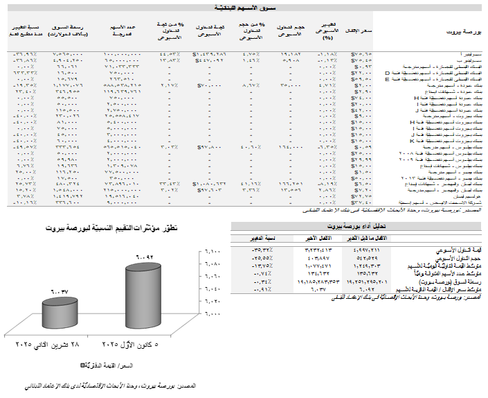 تراجعت حركة التداول على بورصة بيروت في الأسبوع المنتهي في 5 كانون الأوّل حيث إنخفض عدد الأسهُم المتداوَلة إلى 403،897 سهم، مقارنةً ب542،529 سهم في الأسبوع الذي سبقه كما وتدنّت قيمة الأسهم المتداولة إلى 3.23 مليون د.أ.، مقارنةً ب5.00 مليون د.أ. قبل أسبوع. وقد سَيطَرَت أسهُم القطاع المصرفي على الحصّة الأكبر من حجم التداول مشكّلةً نسبة 93.79% من مجموع عدد الأسهم المتداولة.