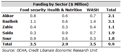 The Lebanon Humanitarian Fund (LHF) has allocated $9.9 million aid as part of its second standard allocation to Lebanon that prioritizes providing life-saving assistance to the most vulnerable individuals in five Lebanese districts (Akkar, Baalbek, Zahle, Saida, and Sour). The LHF adopted a “thematic” approach to target the aforementioned five areas with the most pressing needs and that suffered from a severe drought, displacement due to the conflict, and stressed local resources. The funding is divided between food security ($3.5 million), WASH (Water, Sanitation and Hygiene) ($3.5 million), and health & nutrition ($2.9 million) allocated to the five target districts as follows: