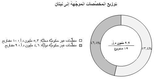 يتوزّع مبلغ ال9.9 مليون د.أ. على شريحتين: الأولى تهبها منظّمات غير حكوميّة محليّة وتبلغ قيمتها 5.3 مليون د.أ. وهي تقسّم على 10 مشاريع والثانية مصدرها منظّمات غير حكوميّة دوليّة وتبلغ قيمتها الإجماليّة 4.6 مليون د.أ. وهي تتوزّع على 9 مشاريع.