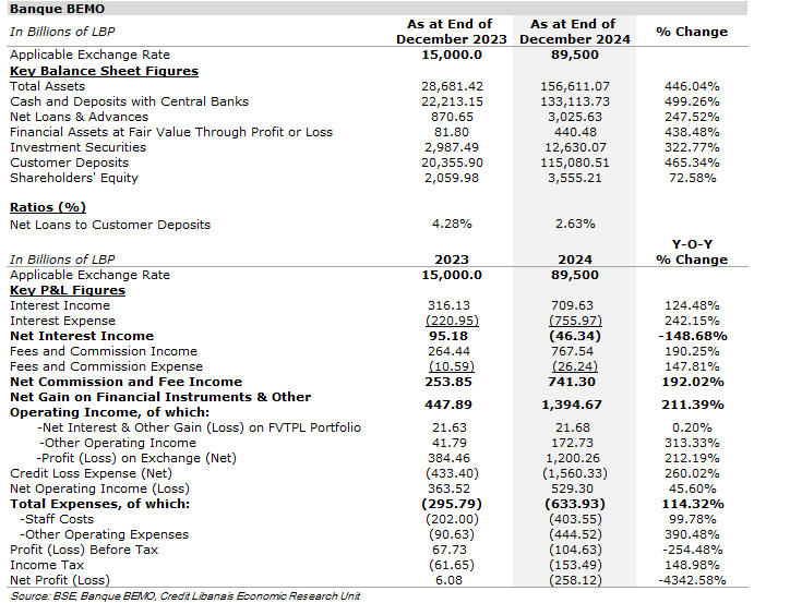 Banque BEMO published its audited financial statements for the year 2024 conveying a huge fluctuation in figures as a result of the change in the official exchange rate from LBP 15,000 per USD in 2023 to LBP 89,500 per USD in 2024. In figures, Banque BEMO reported a net after-tax loss of LBP 258.12 billion ($2.88 million), compared to a net after-tax profit of LBP 6.08 billion ($0.41 million) in 2023. In details, the bank’s net interest loss reached LBP 46.34 billion, with net commission & fee income standing at LBP 741.30 billion. Banque BEMO reported a net gain on financial instruments & other operating income of LBP 1,394.67 billion in 2024 (of which some LBP 1,200.26 billion ($13.41 million) stem from profit on exchange. Banque BEMO booked a net credit loss expense of LBP 1,560.33 billion in 2024. Consequently, the bank registered a net operating income of LBP 529.30 billion in 2024 compared to LBP 363.52 billion in 2023. The bank’s total expenses attained LBP 633.93 billion ($7.08 million) in 2024 of which staff costs of LBP 403.55 billion ($4.51 million) and other operating expenses of LBP 444.52 billion ($4.97 million). On the balance sheet front, Banque BEMO's total assets attained LBP 156.61 trillion ($1.75 billion) at end of 2024 with cash and deposits with Central Banks reaching LBP 133.11 trillion ($1.49 billion) and net loans & advances standing at LBP 3.03 trillion ($33.81 million). Banque BEMO’s financial assets held at Fair Value Through Profit or Loss stood at LBP 440.48 billion, while its investment securities portfolio amounted to LBP 12,630.07 billion. On the liabilities side, customer deposits ended the year 2024 at LBP 115.08 trillion ($1.29 billion) with the bank’s ratio of net loans to customer deposits receding to 2.63% in 2024 from 4.28% in 2023. Banque BEMO’s shareholders’ equity increased from LBP 2.06 trillion in 2023 to LBP 3.56 trillion ($39.72 million) in 2024 as a result of the LBP 1.34 trillion ($33.36 million) increase in revaluation reserves.
