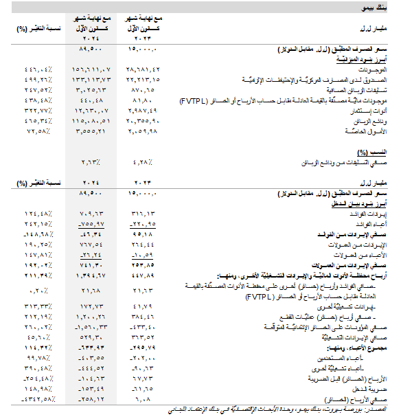 أَظهَرت البيانات الماليّة المدقَّقة لبنك بيمو تقلّب كبير في الأرقام بين عاميّ 2023 و2024 نتيجة تعديل سعر الصرف الرسمي من 15،000 ل.ل. مقابل الدولار الأميركي إلى 89،500 ل.ل. للدولار الأميركي. وقد سجّل المصرف خسائر صافية بلغت قيمتها 258.12 مليار ل.ل. (2.88 مليون د.أ.) في العام 2024 مقارنةً بأرباح صافية بلغت 6.08 مليار ل.ل. (0.41 مليون د.أ.) في العام 2023. في التفاصيل، وصلت الإيرادات من الفوائد إلى مستوى سلبي بلغ 46.34 مليار ل.ل. كما وبلغ صافي أرباح العمولات 741.30 مليار ل.ل. وقد سجّل المصرف أرباح صافية على محفظة الأدوات الماليّة والإيرادات التشغيليّة الأخرى بقيمة 1،394.67 مليار ل.ل. (وهي تشمل صافي أرباح على عمليّات القطع بقيمة 1،200.26 مليار ل.ل. (13.41 مليون د.أ.). تجدر الإشارة إلى أنّ المصرف قد كوّن مؤونات على خسائر إئتمانيّة متوقّعة بقيمة 1،560.33 مليار ل.ل. خلال العام 2024. بالتالي، سجّل بنك بيمو أرباح تشغيليّة صافية بلغت 529.30 مليار ل.ل. في العام 2024 فيما بلغت الأعباء التشغيليّة 633.93 مليار ل.ل. (7.08 مليون د.أ.) في العام 2024 منها أعباء المستخدمين بقيمة 403.55 مليار ل.ل. (4.51 مليون د.أ.) وأعباء تشغيليّة أخرى بقيمة 444.52 مليار ل.ل. (4.97 مليون د.أ.). أمّا على صعيد الميزانيّة، فقد بلغت موجودات بنك بيمو حوالي 156.61 ترليون ل.ل. (1.75 مليار د.أ.) في نهاية العام 2024 فيما وصل رصيد الصندوق والتوظيفات لدى المصارف المركزيّة إلى 133.11 ترليون ل.ل. (1.49 مليار د.أ.) وبلغت محفظة التسليفات الصافية 3.03 ترليون ل.ل. (33.81 مليون د.أ.). وقد وصلت قيمة الموجودات الماليّة المصنّفة بالقيمة العادلة مقابل حساب الأرباح أو الخسائر (FVTPL) إلى 440.48 مليار ل.ل. فيما وصلت قيمة أدوات الإستثمار إلى 3،025.63 مليار ل.ل. أمّا لجهة ودائع الزبائن، فقد بلغ رصيدها 115.08 ترليون ل.ل. (1.29 مليار د.أ.) في نهاية العام 2024 لينخفض بذلك معدّل التسليفات الصافية من ودائع الزبائن إلى 2.63% من 4.28% في العام 2023. وقد وصلت الأموال الخاصّة للمصرف إلى 3.56 ترليون ل.ل. (39.72 مليون د.أ.) في نهاية العام 2024 نتيجة إرتفاع إحتياطي إعادة التقييم ب1.34 ترليون ل.ل. (33.36 مليون د.أ.).