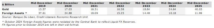 أمّا على صعيد سنوي، فقد إرتفعت الموجودات الخارجيّة بالعملات الأجنبيّة لدى مصرف لبنان ب1.81 مليار د.أ. (17.80%) على صعيد سنوي من 10.18 مليار د.أ. في منتصف شهر كانون الأوّل 2024. في إطارٍ متّصل، زادت قيمة إحتياطات الذهب لدى مصرف لبنان ب15.40 مليار د.أ. (62.49%) على صعيد سنوي عند مقارنتها بالمستوى المُسَجَّل في منتصف شهر كانون الأوّل من العام 2024، والبالغ حينها 24.64 مليار د.أ. نتيجة مواصلة أسعار الذهب وتيرتها التصاعديّة في ظلّ نسب التضخّم العالية والحرب التجاريّة العالميّة التي فرضتها الولايات المتّحدة والتراجع في معدّلات الفوائد والتوتّرات الأخيرة في منطقة الشرق الأوسط.