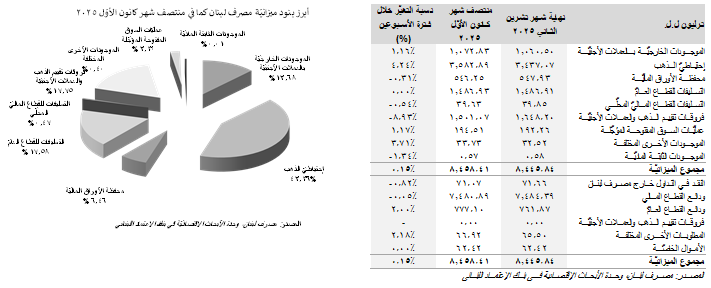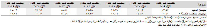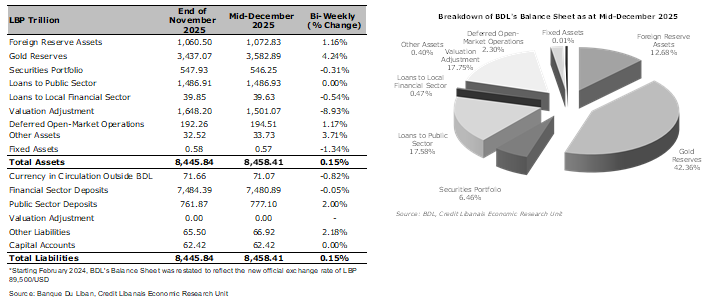 تُظهِر ميزانيّة مصرف لبنان إرتفاع في الموجودات الخارجيّة بالعملات الأجنبيّة بمبلغٍ قدره 137.82 مليون د.أ. (1.16%) خلال النصف الأوّل من شهر كانون الأوّل 2025 إلى 11.99 مليار د.أ. (1،072.83 ترليون ل.ل.)، مقارنةً مع 11.85 مليار د.أ. (1،060.50 ترليون ل.ل.) قبل فترة أسبوعين. يجدر الذكر أنّ الموجودات الخارجيّة بالعملات الأجنبيّة لدى مصرف لبنان قد شهدت زيادة مضطردة خلال الفترة الممتدّة بين بداية شهر آب 2023 (أيّ عند نهاية ولاية الحاكم السابق رياض سلامة) ومنتصف شهر كانون الأوّل 2025 بلغت قيمتها الإجماليّة حوالي 3.41 مليار د.أ. عقب سياسة مصرف لبنان النقديّة الجديدة القاضية بالإمتناع عن تسليف الحكومة ورفع الدعم عن معظم السلع والحدّ من طبع العملة المحليّة. في السياق عينه، زادت الموجودات الخارجيّة بالعملات الأجنبيّة لدى مصرف لبنان بحوالي 1.85 مليار د.أ. منذ مطلع العام الحالي. من جهةٍ أخرى، تُبيِّن ميزانيّة مصرف لبنان زيادة في قيمة إحتياطاته من الذهب بلغت نسبتها 4.24% (1.63 مليار د.أ.) في النصف الأوّل من شهر كانون الأوّل 2025 إلى 40.03 مليار د.أ. (3،582.89 ترليون ل.ل.) في ظلّ إرتفاع أسعار الذهب إلى ما يقارب أعلى مستوى تاريخي لها حيث أنّ الطلب على الملاذ الآمن قد زاد بعيد قيام الفدرالي الأميركي بتخفيض معدّلات الفوائد ب25 نقاط أساس بتاريخ 10 كانون الأوّل إضافةً إلى التراجع في مؤشّر الدولار الاميركي (US Dollar Index).