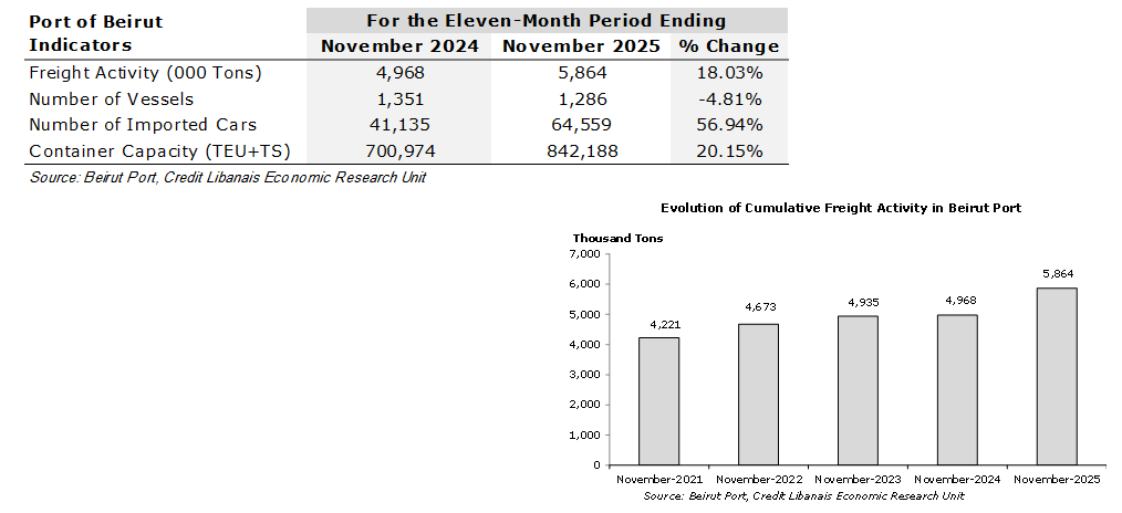 Beirut Port freight activity ebbed slightly during the month of November 2025 with the total weight of shipped goods dropping to around 534.8 thousand tons compared to 557.2 thousand tons a month earlier (4.02% decrease). On a cumulative basis, however, freight activity rose by a robust 18.03% y-o-y during the first eleven months of 2025 to 5,864 thousand tons up from 4,968 thousand tons a year earlier. The number of vessels, however, dropped by 4.81% year-on-year to 1,286 in comparison with 1,351 in the same period in 2024, while the number of imported cars increased by 56.94% to 64,559 cars. In a related context, the Beirut port handled containers with a total cargo capacity of around 842.19 thousand TEUs (including transshipments) in comparison with a smaller cargo capacity of 700.97 thousand TEUs a year earlier.