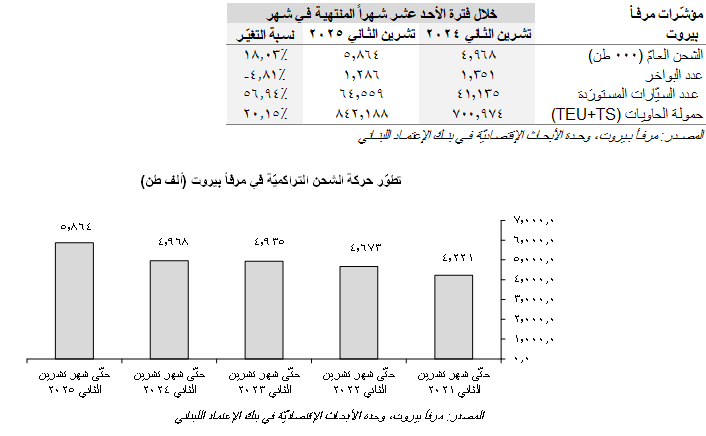 تراجعت حركة الشحن العامّ عبر مرفأ بيروت خلال الشهر الحادي عشر من العام 2025 حيث إنخفض الوزن الإجمالي للبضائع إلى 534.8 ألف طن في شهر تشرين الثاني مقابل حوالي 557.2 ألف طن في شهر تشرين الأول (إنكماش شهريّ نسبته 4.02%). أمّا على صعيد تراكمي، فقد إرتفعت حركة الشحن بنسبة 18.03% سنويّاً إلى 5،864 ألف طن خلال الأشهر الإحدى عشر الأولى من العام 2025 مقارنةً مع 4،968 ألف طن خلال الفترة ذاتها من العام 2024. من جهةٍ أخرى، إنخفض عدد البواخر بنسبة 4.81% على أساسٍ سنويٍّ إلى 1،286 باخرة حتّى شهر تشرين الثاني 2025 مقارنةً مع 1،351 باخرة خلال الفترة نفسها من العام 2024 فيما زاد عدد السيّارات المستوردة بنسبة 56.94% إلى حوالي 64،559 سيارة. وقد إستقبل مرفأ بيروت حاويات ذات قدرة إستيعاب بلغت حوالي 842.19 ألف وحدة مكافئة لعشرين قدم (TEU) حتى شهر تشرين الثاني من العام 2025 مقارنةً مع 700.97 ألف وحدة مكافئة لعشرين قدم (TEU) خلال الفترة ذاتها من العام 2024.
