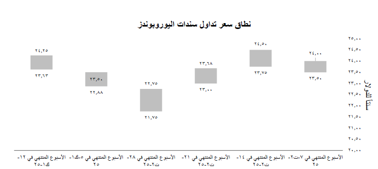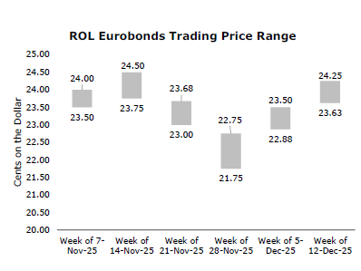 تراجعت أسعار سندات اليوروبوندز اللبنانيّة هذا الأسبوع وسط تدفقّات لناحية العرض والطلب، حيث إستقرّت الأسعار عند 23-24 سنتاً للدولار. وركّز المسؤولون اللبنانيون مناقشاتهم خلال الأسبوع على الإصلاحات الإقتصاديّة والسياسيّة الأساسيّة، بما في ذلك مراقبة وقف إطلاق النار. في هذا الإطار حاملو سندات اليوروبوندز على نهج حذر.