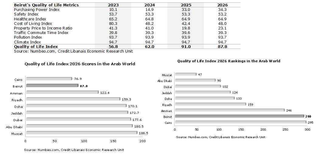 On the local front, Beirut ranked 290th among 304 cities in the world and second to last among covered Arab cities in Numbeo’s 2026 Quality of Life Index, with a score of 87.8, underperforming its 2025 score of 91.0. The following table portrays Beirut’s performance in the 8 pillars of the Quality of Life Index over the period spanning between 2023 and 2026. While most sub-indices witnessed minor changes in their values on an annual basis, the cost of living index and property price to income ratio witnessed a sizeable deterioration.