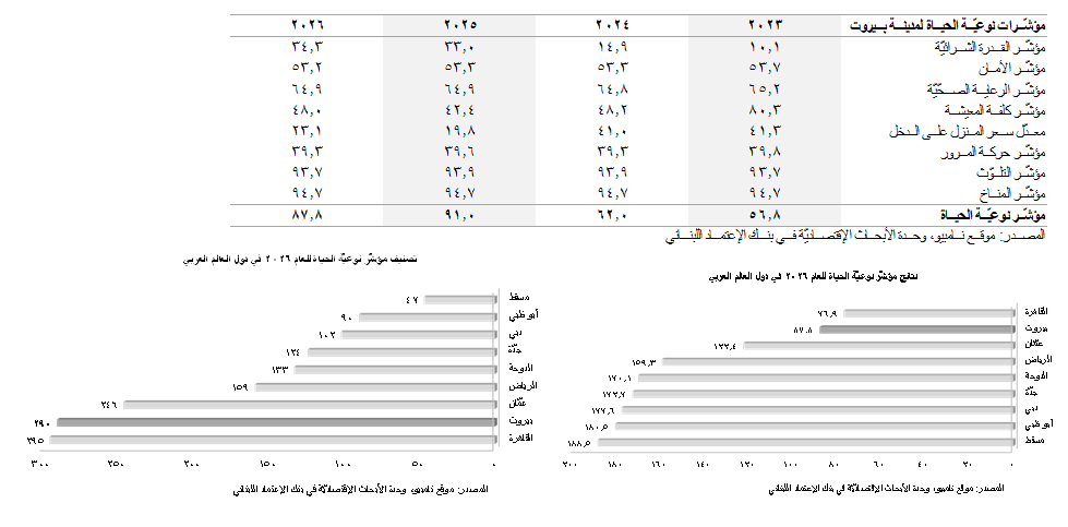 محليّاً، أتت العاصمة بيروت في المرتبة 290 ضمن 304 مدينة في العالم والما قبل الأخيرة ضمن المدن العربيّة المشمولة في مؤشّر نوعيّة الحياة للعام 2026 الصادر عن موقع نامبيو بنتيجة 87.8 مقارنةً مع نتيجة 91.0 في مؤشّر العام 2025. يُظهِر الجدول التالي أداء مدينة بيروت في الركائز الثمانية لمؤشّر نوعيّة الحياة خلال الفترة الممتدّة بين العام 2023 والعام 2026. وفيما سجّلت أغلب المؤشّرات تغيّرات سنويّة طفيفة (أكانت صعوداً أو نزولاً)، سجلّ مؤشّريّ كلفة المعيشة وسعر المنزل على الدخل تراجع ملحوظ بين العام 2025 و2026.