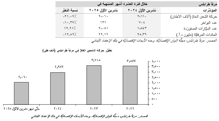 تحسّنت حركة الشحن العامّ عبر مرفأ طرابلس خلال الشهر العاشر من العام 2025 حيث زاد الوزن الإجمالي للبضائع إلى 243 ألف طن في شهر تشرين الأوّل مقابل حوالي 229 ألف طن في شهر أيلول (إرتفاع شهريّ نسبته 6.11%). في التفاصيل، شَكَّلَت الشحنات الوارِدة 76.13% (185 ألف طن) من الوزن الإجمالي للبضائع، في حين بلغت نسبة الحمولات المصدَّرة 23.87% (58 ألف طن). أمّا على صعيدٍ تراكميٍّ، فقد تراجع الوزن الإجمالي للبضائع المشحونة عبر مرفأ طرابلس بنسبة سنويّة بلغت 21.07% إلى 2،060 ألف طن في الأشهر العشرة الأولى من العام 2025 مقارنةً ب2،610 ألف طن خلال الفترة نفسها من العام 2024. بالتوازي، إنخفض عدد البواخر بنسبة 10.37% على أساس سنويّ إلى 631 باخرة فيما زاد عدد السيّارات المستوردة ب238 (12.91%) إلى 2،081 سيّارة مقارنةً ب1،843 سيّارة خلال الفترة نفسها من العام 2024. أمّا في ما يخصّ العائدات المرفئيّة لمرفأ طرابلس، فقد إنكمشت هذه الأخيرة بنسبة سنويّة قدرها 12.59% إلى 22.19 مليون د.أ. حتّى شهر تشرين الأوّل 2025 مقارنةً ب25.39 مليون د.أ. في الفترة نفسها من العام 2024.