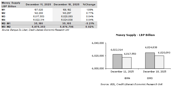All monetary aggregates ended the week of December 18, 2025 on a positive note. The overall money supply, “M4”, widened by LBP 2,524.31 billion on a weekly basis to LBP 6,024.84 trillion, noting that the non-banking sector’s Treasury bills portfolio decreased by LBP 16.28 billion during the concerned week.