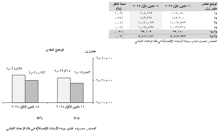 أنهت كلّ المؤشّرات النقديّة أسبوعها المنتهي في 18 كانون الأوّل 2025 على وقعٍ إيجابيّ. في التفاصيل، إرتفعت الكتلة النقديّة بمفهومها الواسع، "م4"، ب2،524.31 مليار ل.ل. على صعيدٍ أسبوعيٍّ إلى 6،024.84 ترليون ل.ل. علماً أنّ محفظة سندات الخزينة المكتتَب بها من قِبَل القطاع غير المصرفي قد إنخفضت ب16.28 مليار ل.ل. في الأسبوع المذكور.