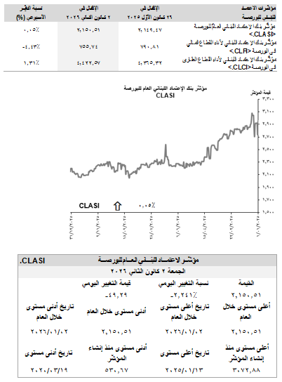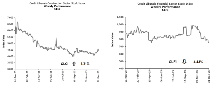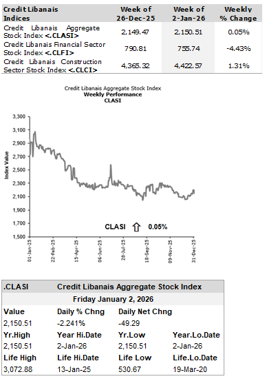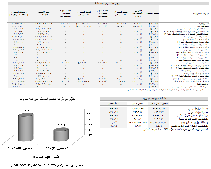 كانت حركة التداول على بورصة بيروت ضعيفة في الأسبوع المنتهي في 2 كانون الثاني 2026 في ظلّ أعياد نهاية رأس السنة حيث إنخفض عدد الأسهُم المتداوَلة إلى 256،698 سهم، مقارنةً ب426،362 سهم في الأسبوع الذي سبقه وتدنّت قيمة الأسهم المتداولة إلى 7.75 مليون د.أ.، مقارنةً ب29.31 مليون د.أ. قبل أسبوع. وقد سَيطَرَت أسهُم القطاع المصرفي على الحصّة الأكبر من حجم التداول مشكّلةً نسبة 62.72% من مجموع عدد الأسهم المتداولة.